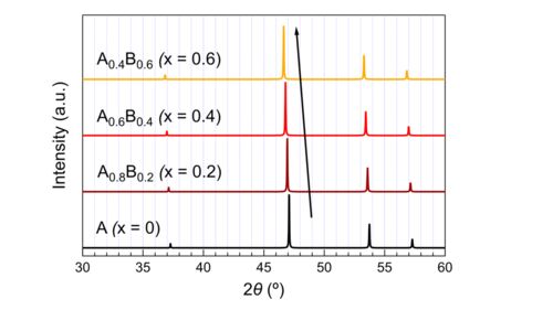 固溶体のXRDを測定したとき、各組成のXRDパターンのピーク位置が連続的にずれていくことが知られています.このXRDパターンから格子定数を求め、「ベガード則」によって組成を(簡易的に)見積もることができます.