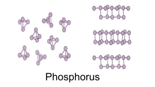 外殻に5つの価電子を持つために多様な共有結合様式を取ることのできるリンは、単体の中でも原子の配列や結合様式の異なる複数の姿があります.すなわち、リンには同素体(allotrope)が複数存在します.
