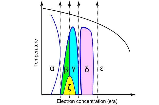 Hume-Rotheryは、金属の電子数と結晶構造の関係性についても重要な指摘をしています.ある合金において、価電子の総数と原子数の比()が一定であれば、元素や組成が異なっても同じ結晶構造の合金が得られるというものです.例を挙げましょう.