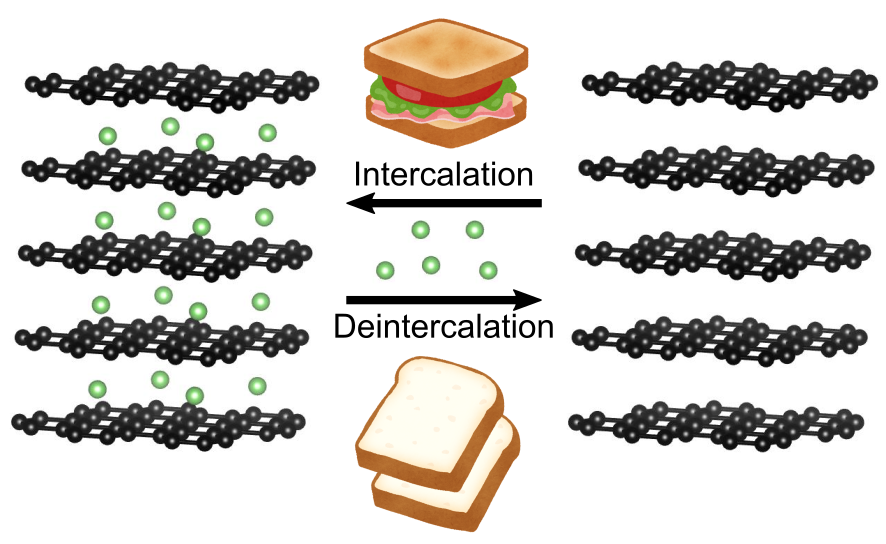 イオンは、黒鉛中の炭素層の間の隙間に蓄えられます.このような反応はインターカレーション反応と呼ばれ、電極に大きな構造変化を起こすことなく脱挿入が可能です.そのため、充放電中の負極材料の体積変化を低く抑えることができます.
