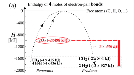 ということは、この反応における大きな燃焼エネルギーは「炭化水素の持つエネルギー」ではなく「酸素の持つ大きなエネルギー」が主に寄与しているのではないかと考えられます.すなわち、大きな発熱の原因は炭化水素ではなく酸素なのではないかと思えるわけです.この場合、酸素1 molあたりという大きなエンタルピー変化を説明します.